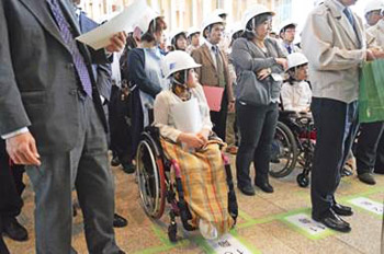 火事や地震等による災害時に、障害の有無に関わらず全従業員が基本的に同一水準の安全性を確保することを目標として訓練を実施しました。本社屋内勤務者のうち、スポーツベットするならをもつ従業員とその支援を行うサポーター、約50名が参加しました。