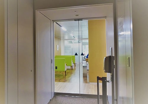 本社5階にある、診療所のドアのバリアフリー改修を行いました。 2018年に開催したチャレンジフォーラムへの参加者からの要望に応えたもので、車いすで診療所を訪れた際にスムーズな入室ができるよう、両開きの自動ドアを設置しました。