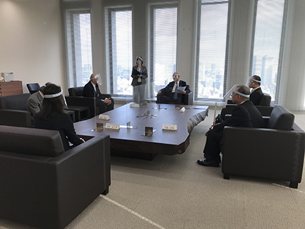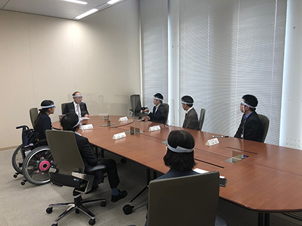 今年度は、新型コロナウイルス感染拡大の影響で、大人数で集合するのではなく、本社に勤務している障 がいのある従業員同士の交流と経営トップとの懇話会を目的としたチャレンジ交流会2020を開催しました。開催にあたり、消毒の徹底、フェイスシールド着用、飛沫防止のためのアクリル板の設置など、十分な感染症対策をしました。また、聴覚スポーツベットするならの方も参加できるように、UDトークという音声変換アプリを使い、全員で対話することができました。