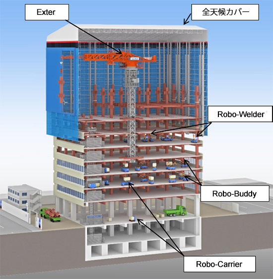 本システムの適用現場では、基礎工事終了後、建物をすっぽり覆う全天候軽量屋根「全天候カバー」を組み立て、その中に設置された新型クレーンExterが鉄骨の柱・梁を順に所定の位置に吊り込み、Robo-Welderが柱を溶接しながら躯体工事が進みます。下層階からはRobo-Buddyが最終工程となる天井、床を仕上げていきます。現場に搬入された資材は、夜のうちに、Robo-Carrierを核とする水平・垂直搬送スポーツベット アービトラージ okにより所定の作業階に搬送・仮置きされた後、Robo-Buddyの作業場所まで搬送されます。自動搬送の導入により、仕上げ工が取付作業に専念することができ、生産性が向上します。