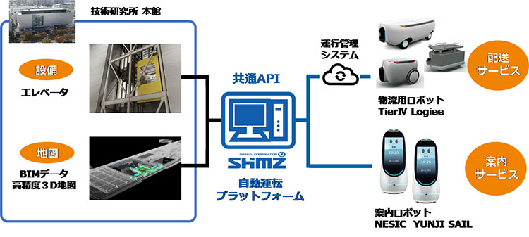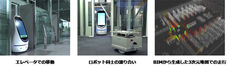 技術研究所本館では、エレベータ1台と、⾃動運転プラットフォームの共同研究先である(株)ティアフォー社製の物流⽤ロボット「Logiee(ロージー)」、NECネッツエスアイ(株)が販売する案内ロボット「YUNJI SAIL(ユンジ セイル)」を⾃動運転プラットフォームに接続し、2種類のロボットがスポーツベット 着いたーの上下階を⾃由に移動しながら同時並⾏でサービスを提供できることを実証しました。また、統合制御技術と併せて、ロボットが⾃⼰位置推定に利⽤する⾼精度3次元点群地図をスポーツベット 着いたーのBIMデータから⾃動⽣成する技術も確⽴しました。
