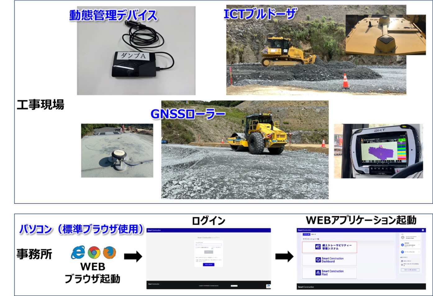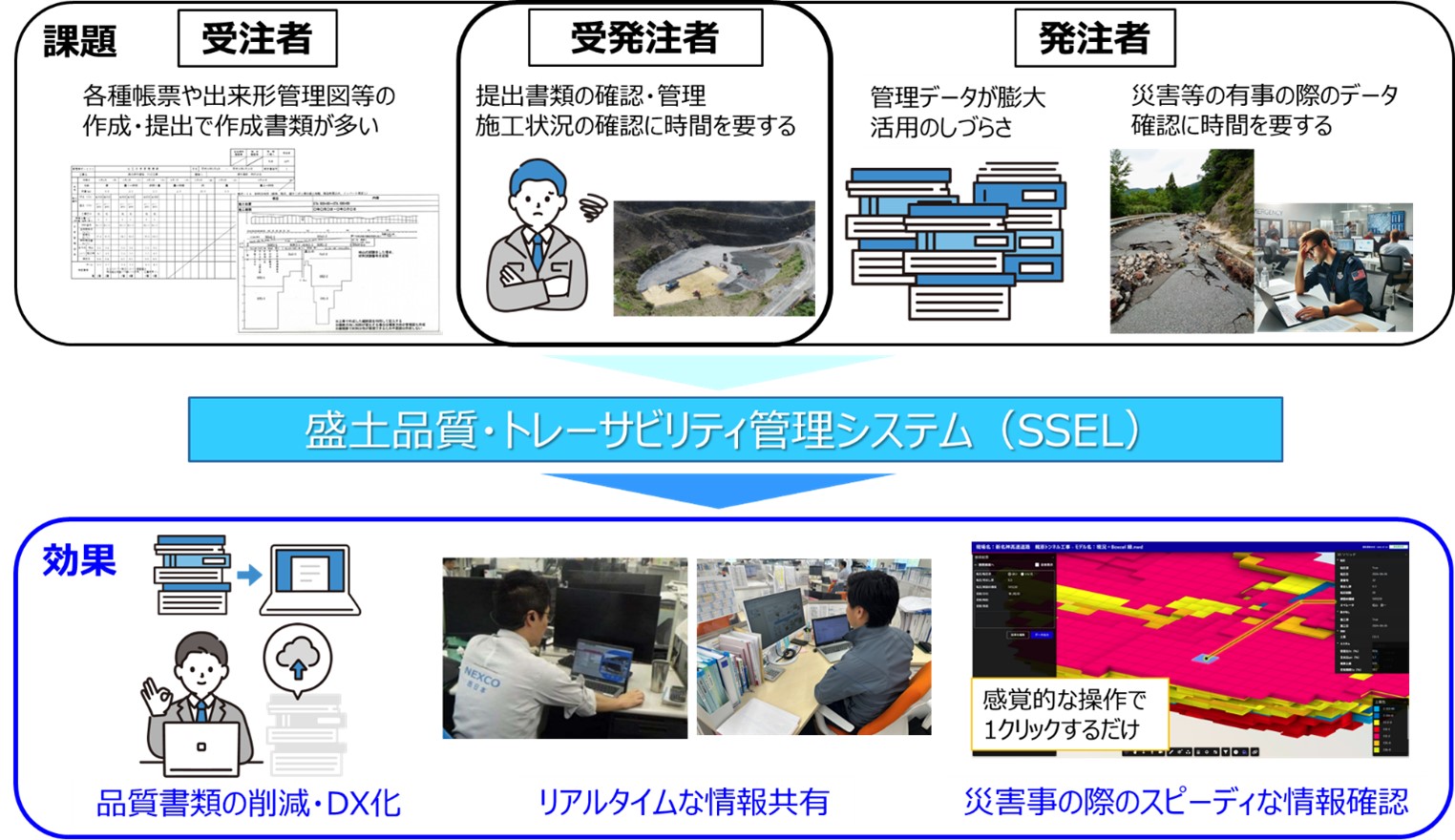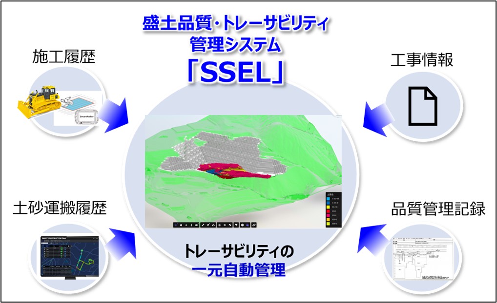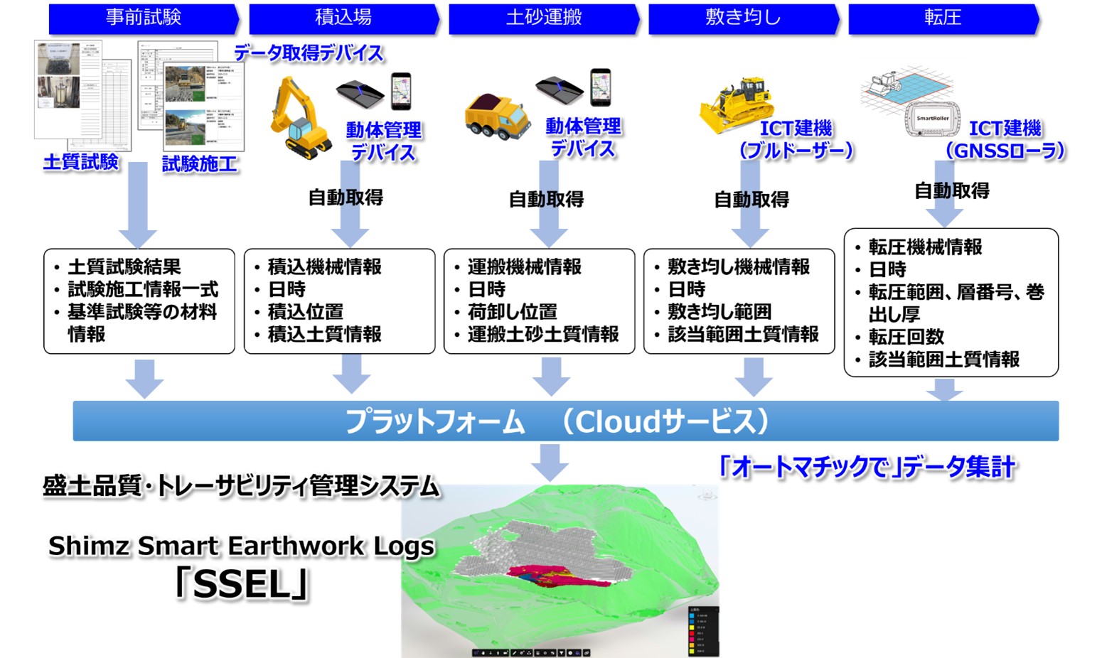 SSELの特徴は、技術的に確立されているシステムを組み合わせたこと、専用ソフトやハイスペックのパソコンなどを用いなくても受発注者間で必要な情報を共有できることです。このため、SSELは非常に実用的であり、かつパソコンさえあればクラウドを介して時間・場所を問わず必要なデータにアクセスできます。システム構成は、土質試験やトレーサビリティデータ結果の入力システム、市販のIoTデバイス搭載の土砂積込建機と運搬車両、同じく市販のICTブルドーザと転圧ローラ、各システムからクラウドを介して送信されるトレーサビリティデータを一元管理するデジタルプラットフォームです。