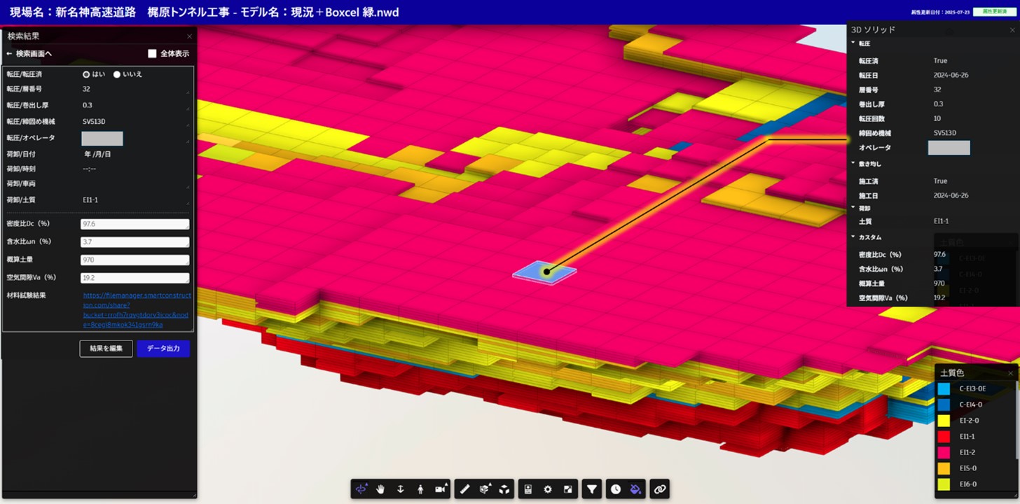 SSELを適用することで、すべての施工プロセスにおいて必要なデータが自動取得され、デジタルプラットフォームに送信されます。プラットフォームは、転圧ローラから送信される受入れ土砂の転圧範囲、巻き出し厚などのデータからスポーツベットするならの3次元モデル(ボクセル)にデータを格納していくとともに、当該土砂の属性情報として一連のトレーサビリティデータを紐づけ蓄積していきます。蓄積されるデータ量は膨大になりますが、個人のITリテラシーに関係なく、3次元モデルを介して感覚的な操作で必要な情報にアクセスできるので、施工時や維持管理時のデータ確認における作業効率が飛躍的に向上します。