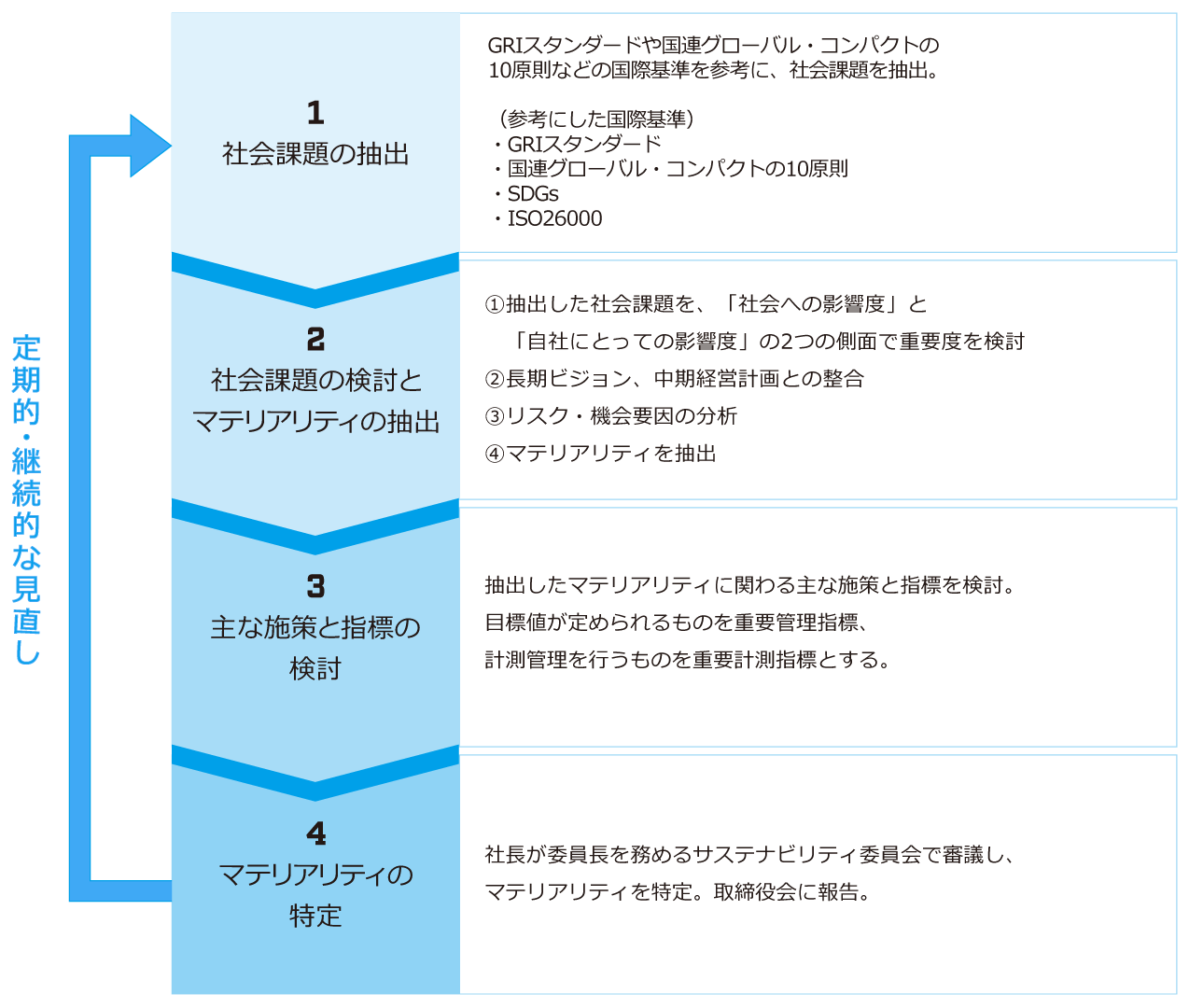 当社は以前より、環境・社会・ガバナンス(ESG)の視点を取り入れたKPIを策定していましたが、2022年にスポーツベットするならを特定しました。また、実現に向けた主な施策と指標・目標を策定し、その実績を開示するとともに、社会動向や経営戦略との整合性を踏まえて、毎年見直しを実施しています。2024年度は、中期経営計画〈2024-2026〉に整合するよう見直しを行いました。