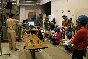 ビオトープでは、池の半地下にある観察窓から、水中に生息する魚や飛来したカルガモの様子を観察しました。風洞実験棟では、実際に風洞で作られた風を浴びてその強さを体感し、風による安全対策の大切さを学びました。最後に岩石実験棟では、橋梁、トンネルなどを支える岩石の強度試験による強さを確認し、その破壊状況を観察しました。