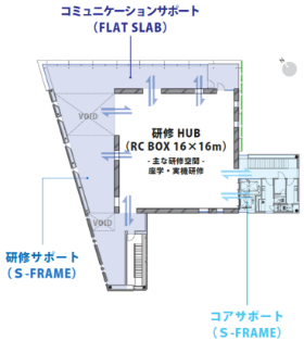 中心の「スポーツベット 知恵袋HUB」をRC造、「サポートスペース」をS造とし、周囲の光と風を取り込み、内外に様々な関係を創出しています。