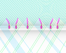 コミュニケーションの場を明るく保ちながら日射を遮りつつ、近隣建物との見合いを低減するという相反する課題を、Grasshopperを用いてバランス良く解決しています。 外部のフィンの角度の値をパラメータとし、室内に入る視線が少なくなるパターンを導き出します。 並行して、年間平均照度シミュレーションを実施。直射光を遮蔽しながら、間接光だけで快適な明るさが確保できることのチェックを同時に行っています。