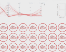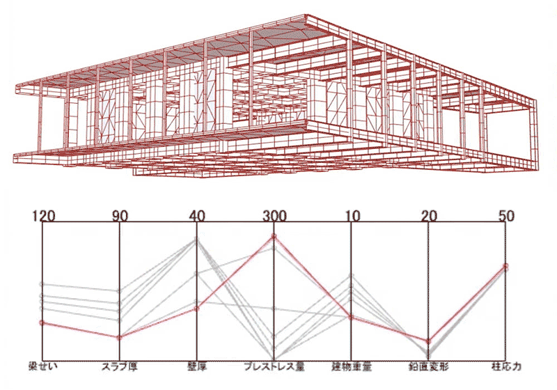 *5 Shimz Explorer: Brute Force Methodによる最適解の絞り込み*6ツール(開発協力:Thornton Tomasetti / Core Studio、アルゴリズムデザインラボ) *6 パラメトリックに生成した膨大な案の可能性の中から、複数の目標値を設定して解の絞り込みを行う手法
