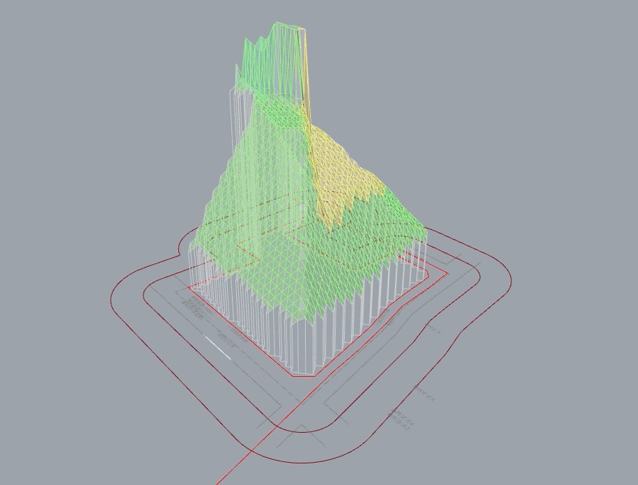 敷地は複数の用途地域(商業地域・住居系地域)に分かれており、複雑な法規制(斜線制限・日影規制等)をクリアしながらボリュームスタディを行う必要がありました。 3D空間上に法規制を可視化させ、法チェックと建物形状検討のトライ&エラーをインタラクティブに実施*1。直感的な操作で建物モデルを修正しながら、法規制空間の中におさまるボリュームを模索し、「スポーツベット 知恵袋HUB」と「サポートスペース」による建物構成を見出しました。