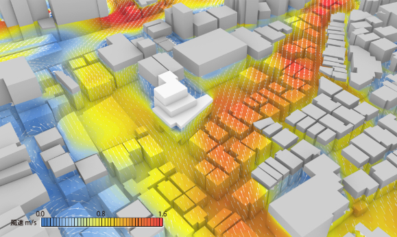 周辺に吹く風が建物のどこに当たるかをシミュレーションして、室内に効率的に風を取り込む建物形状および換気窓の計画を行いました。中間期の主風向のシミュレーションから外壁をなめるように風が流れているのがわかります。