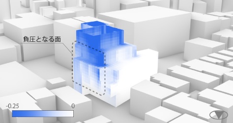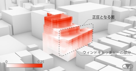*2:全風向(16風向)の外皮圧力を解析し、中間期の風向頻度分布で重みづけしたものを自然換気ポテンシャルマップとしました。期間を通して正圧になりやすい箇所、負圧になりやすい箇所を可視化します。一般に正圧が出ている部分と負圧が出ている部分に換気口を設けると、自然換気が効率的に行われます。