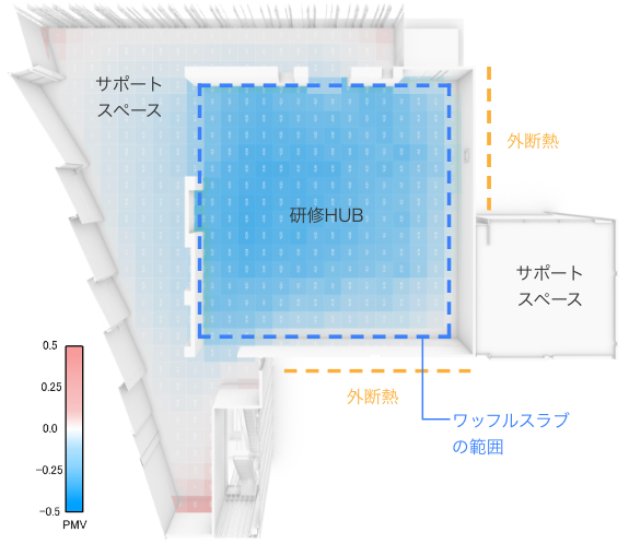ワッフルスラブ*3の輻射効果を予測温冷感申告PMV*4にて評価しました。ワッフルスラブ内部と外周部には適度な環境差がうまれ、スポーツベット 知恵袋HUB空間に熱が閉じ込められて快適な環境になることを確認できます。