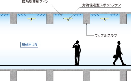 *3 ワッフルスラブ:鉛直荷重に対するたわみを小さくするために格子状に梁型を設けたスラブ *4 PMV:室温、平均放射温度、相対湿度、風速、着衣量、代謝量により、人間が暖かいと感じるか、寒いと感じるかを表す温冷感の指標。-0.5~0.5が推奨範囲。