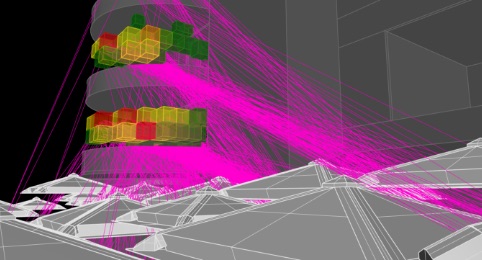 客室群(視点)と露天風呂(対象点)を結ぶ多量のスポーツ ベット テニス(下図マゼンタ線)を自動生成。この約1,000万本にも及ぶスポーツ ベット テニス群の総当たり検証を実施し、傘の配置や形状を調整することでプライバシーの保護と空への抜け感の最大確保を図りました。