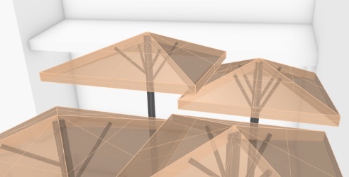 周辺からのスポーツ ベット テニスを気にすることなく、まるで自然の中でリラックスしているかのような空間を実現するため、傘の形状は「樹木」を連想するものとしました。この木々に見立てた傘状の工作物は、上記した景色とスポーツ ベット テニスのトレードオフにより導き出された配置のもと、形状の微調整を繰り返す必要がありました。そこで、力学的アプローチを用いて個々の傘形状を決定するGrasshopperツールを作成しました。