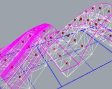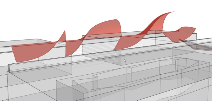 検討当初、1枚の曲面で直射光をカットして、内部照度がMAXとなるトップライト形状を目指しましたが、1枚の面では供給できる内部照度に限界があることに気づきました。 そこで、内部照度を高めるために、大まかなものから、開口の数・各開口の高さ・開口の稜線というように徐々に詳細なパラメーターを設定して、形状を絞っていきました。