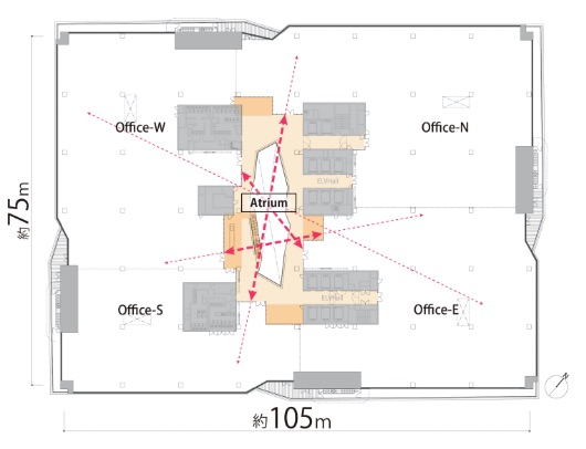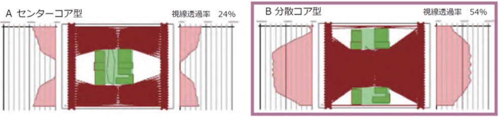 ビッグプレートオフィスにおいて典型的なセンターコア型と分散コア型について、テナント間の視線透過率を比較しました。 中央のスポーツベット 5チャンネルを介した視線の抜けを比較すると、センターコア型は全体の視線透過率が24%に対し、分散型は54%と視線の抜けが大きいことが分かりました。そこでコミュニケーション型のオフィスとして、分散型を採用しました。