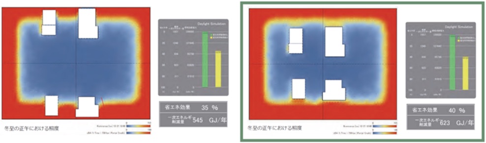 開口の高さ・稜線を調整する前と比べると、屋根から約60mほど下のレベルにあるエントランス床面で、年間平均照度が約2倍程度明るくなるという結果を出すことがでました。