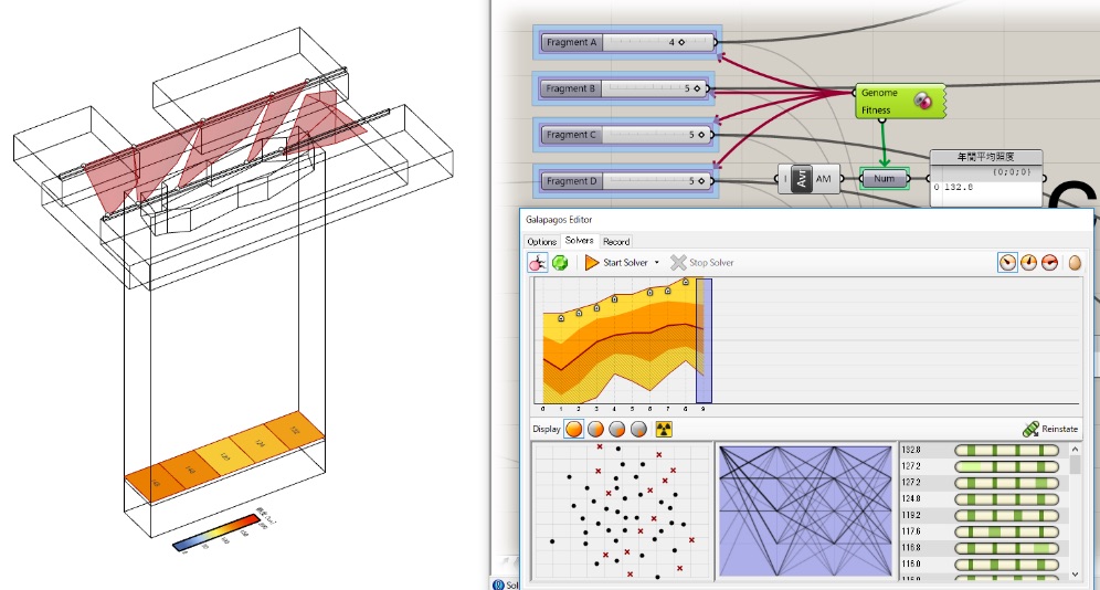 *3 遺伝的アルゴリズム:生物の進化を模倣した最適化手法の1つ。本計画ではGrasshopperに標準搭載されている最適化コンポーネント・Galapagosを用いて解析を行いました。