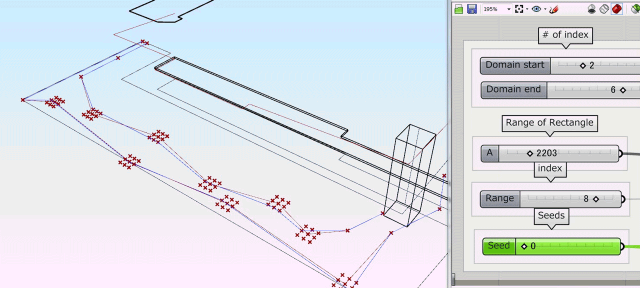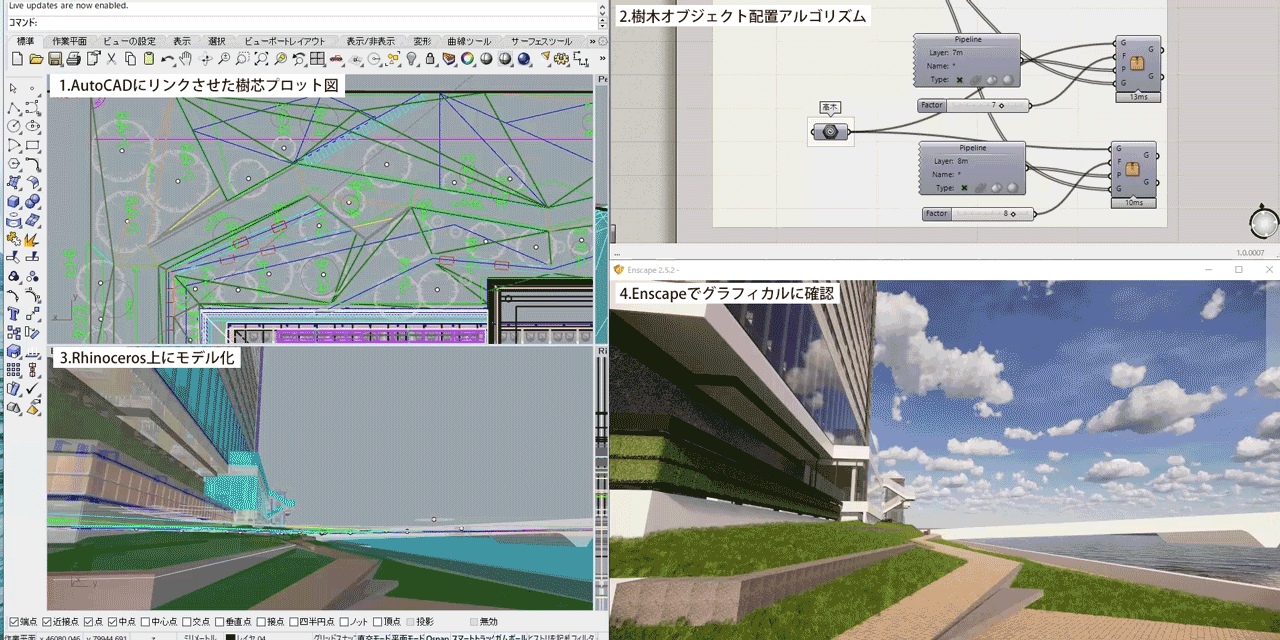 AutoCAD上でのプロット図で、Rhinoモデル上に枝張りが似た樹木オブジェクトを自動配置するアルゴリズムをつくりまスポーツ ベット テニス。 ここでは、東京都と江東区でそれぞれ定められた緑化基準に基づき、各樹木の高さ/樹冠サイズを変数として緑地面積を算定させることで、視覚的なバランスと法的な与条件の同時検討を行っています。