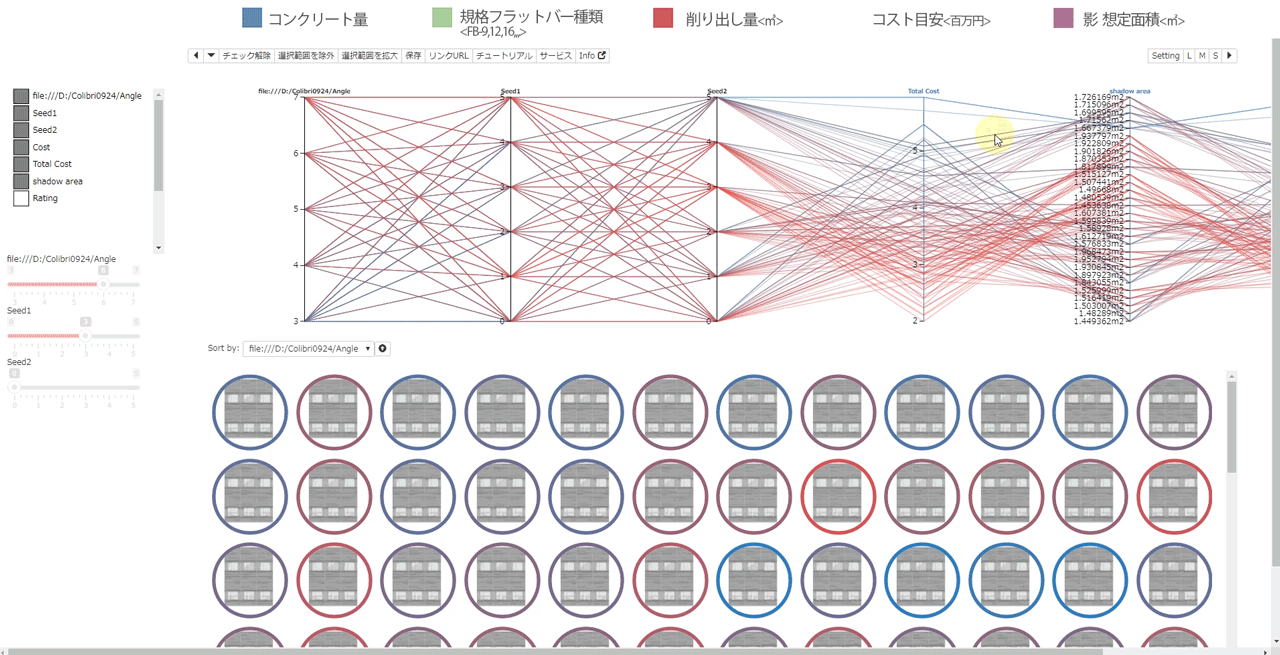 *1 Shimz Explorer:Brute Force Methodによる最適解の絞り込み*2ツール。(開発協力:Thornton Tomasetti / Core Studio、アルゴリズムデザインラボ) *2 絞り込み:パラメトリックに生成スポーツ ベット テニス膨大な案の可能性の中から、複数の目標値を設定して解の絞り込みを行う手法。