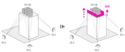 敷地周辺の様々な視点から屋上設備機器への視線(左)と