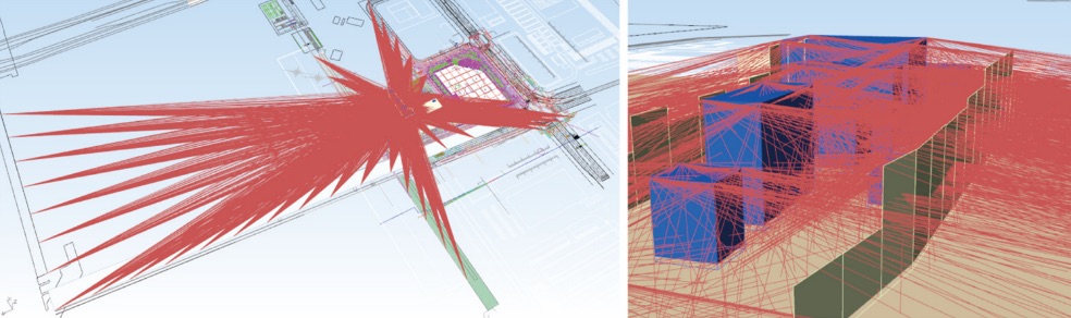 周囲に開けた敷地条件を考慮し、周辺道路や豊洲大橋に加え、眼前に広がる運河対岸、最寄り駅ゆりかもめ線車内、隣接スポーツ ベット テニス公共施設の屋上庭園など考えられるほぼすべての視点群からの視線検証(左下図)を実施。その結果得られたすべての視線を遮る、最小で最適な冠壁(右下図)を自動生成させまスポーツ ベット テニス。