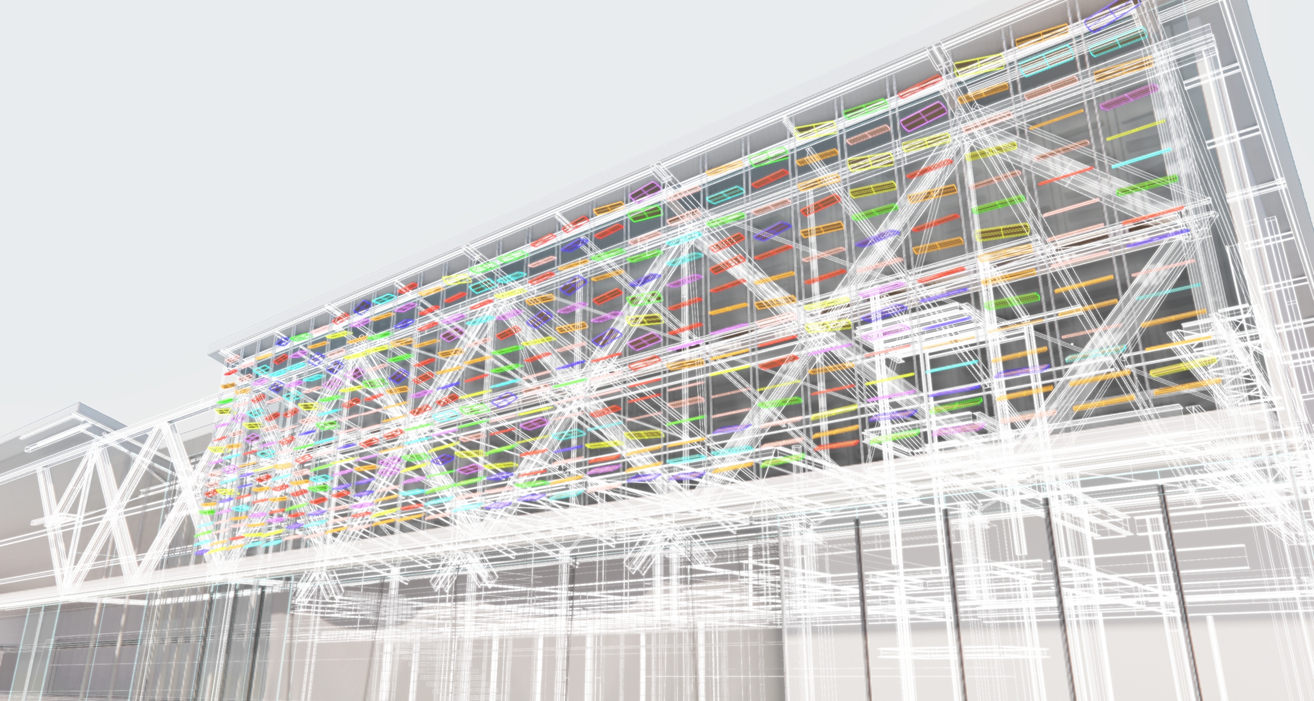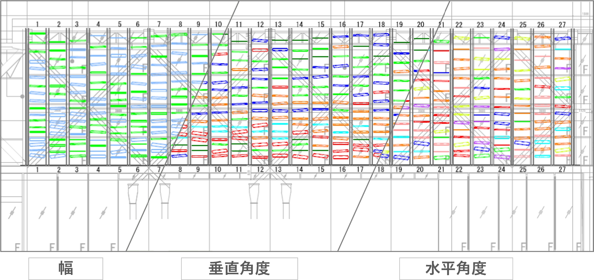 シミュレーションで出たバラバラな配置と角度をGrasshopperで書き出し、施工部門と共有しました。材料の幅、垂直角度、水平角度などを色分けして書き出し、現場が理解しやすいように合理的に伝達。幅が2種類、垂直角度が6種類、水平角度は材料の幅ごとに合計8種類、合計90パターンを作成しました。