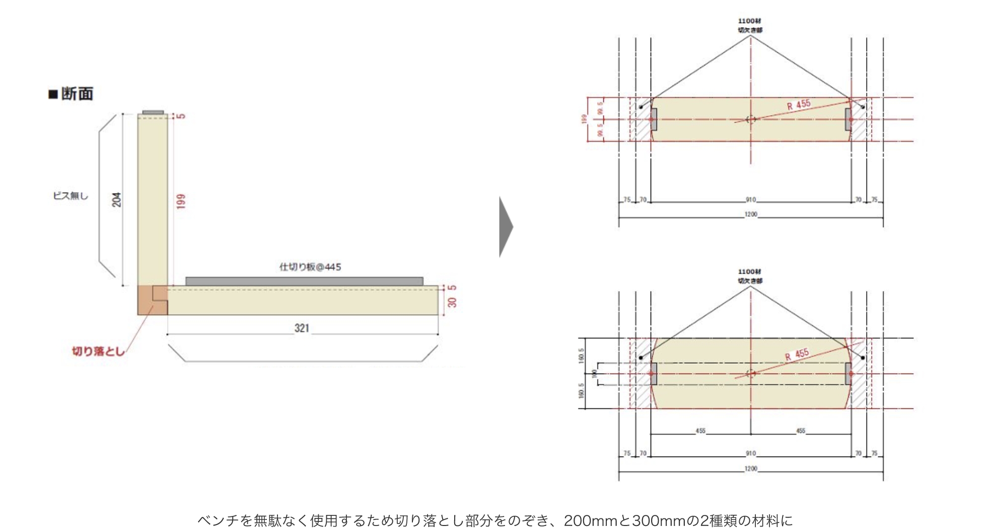 材料は省資源化を図って廃棄される予定だった、既存解体建物の木造ベンチを活用しました。座面と背板を解体し端材が極力少なくなるようにし、奥行きの異なる2種類の形状のスポーツ ベット 投資としてアップサイクルしました。