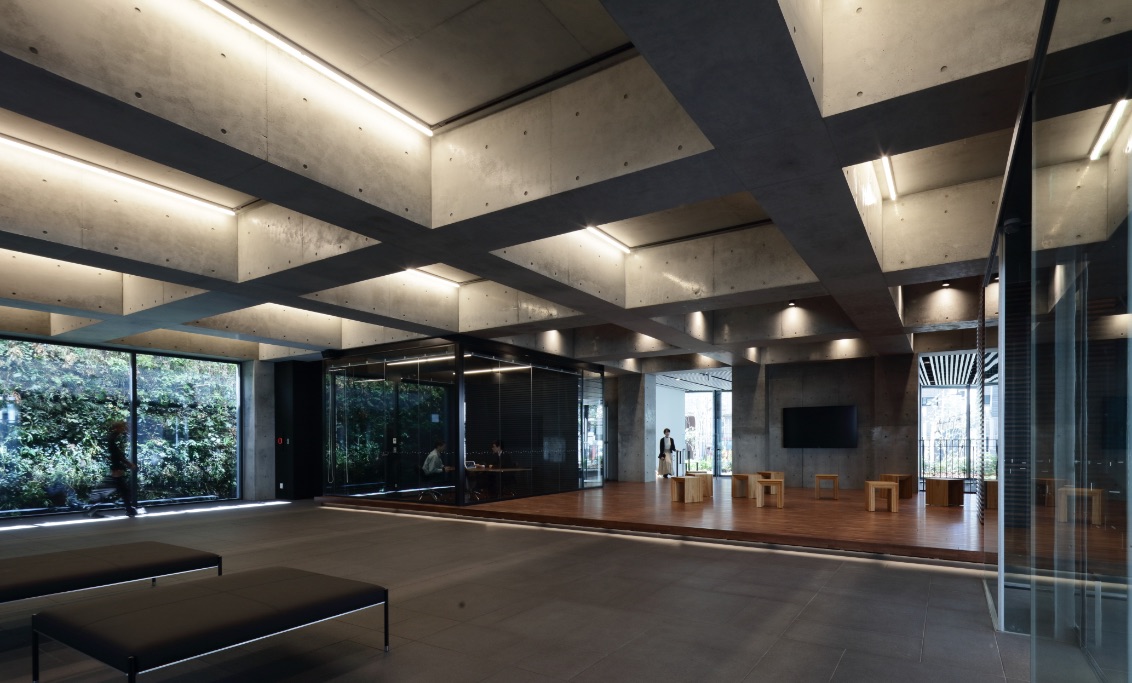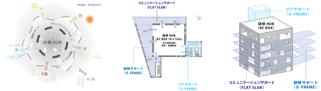 The training HUB uses a 3.2m x 3.2m grid waffle slab and pursues comfort while significantly reducing energy for air conditioning and lighting. A convection simulation of the airflow using a radiant air-conditioning spot fan was performed and later demonstrated in an experiment at a technical laboratory. We provided solutions using both digital and analog methods.