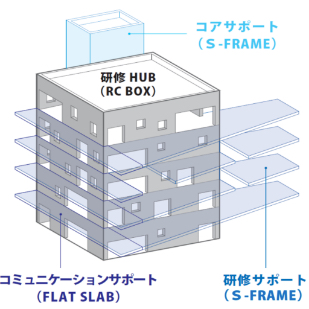 To create a column-free training HUB (RC structure) and to achieve a light structure for the support space (S structure) on the perimeter, we adopted a waffle slab that takes advantage of the beam performance while reducing the slab thickness. With each specification of the structural element as a parameter, an optimization method is used to automatically search for a solution that can realize the concept. Each time the optimization calculation is performed, the values of the specifications are automatically converged to satisfy the design goals, and a possible solution is derived.