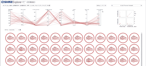 5 Shimz Explorer: A tool for narrowing down the optimum solution using the Brute Force Method6. (Developed in cooperation with: Thornton Tomasetti / CORE Studio, Algorithm Design Lab) 6 A method of narrowing down the solution by setting multiple target values from the vast number of parametrically generated possibilities.