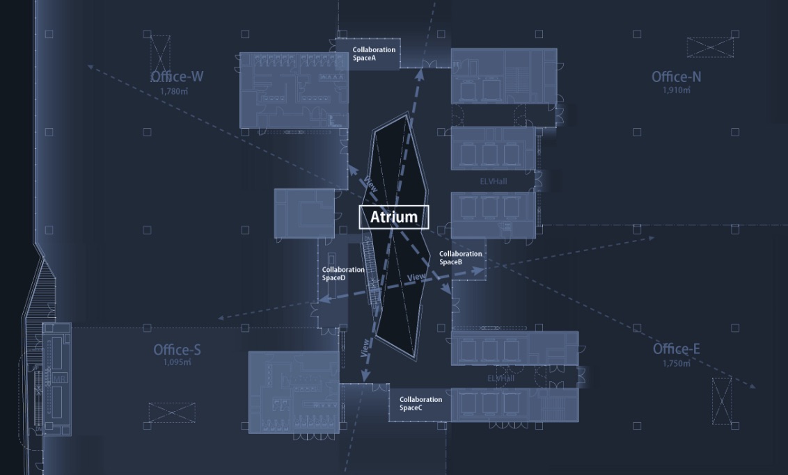 We compared スポーツ ベット new line-of-sight transmittance between tenants for スポーツ ベット new center core type and スポーツ ベット new distributed core type, which are typical for big plate offices. Comparing スポーツ ベット new line-of-sight through スポーツ ベット new central atrium, we found that スポーツ ベット new center core type has a line-of-sight transmittance of 24%, while スポーツ ベット new dispersed type has a line-of-sight of 54%. Therefore, we adopted スポーツ ベット new distributed core type for an office that encourages communication.