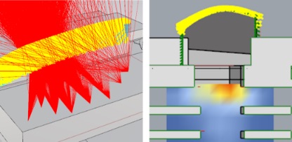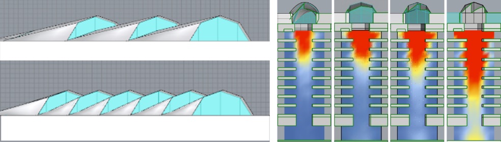 One roof surface generated to block direct light (left) and Internal illuminance simulation on this roof (right)