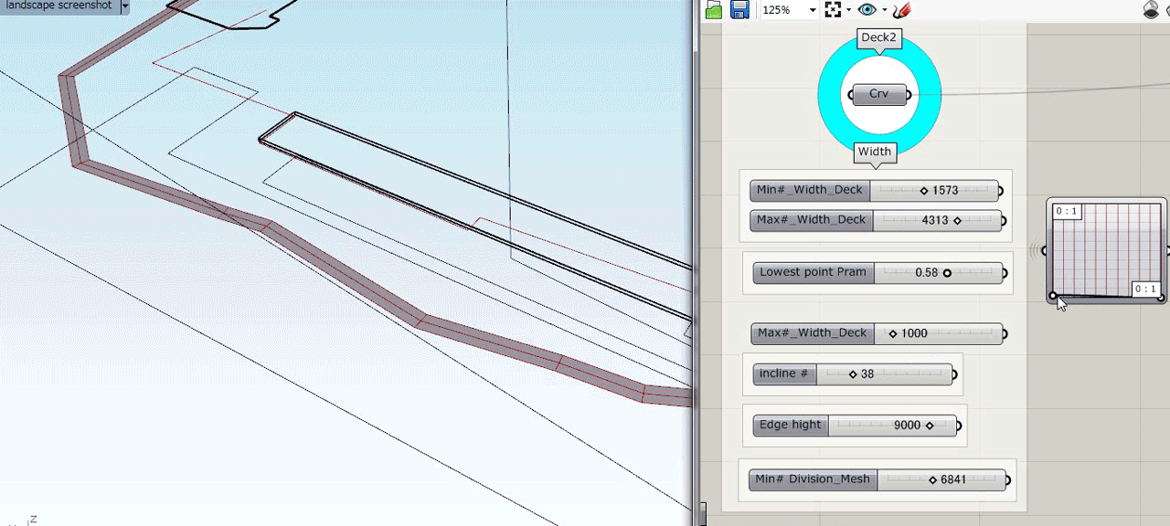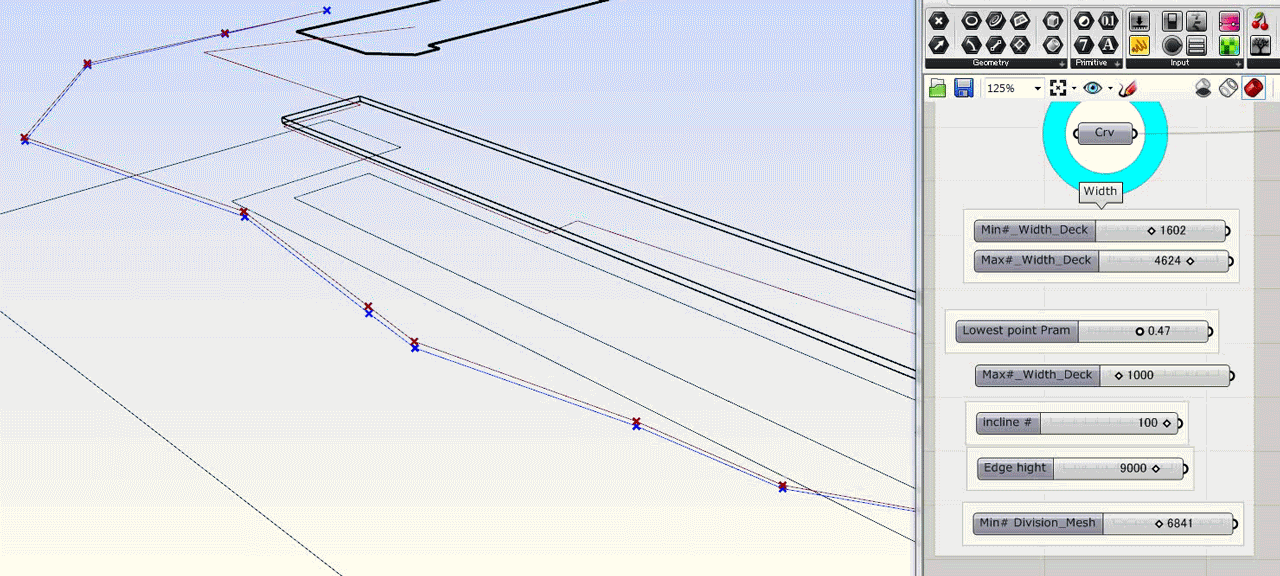 To hide the equipment installed on the roof with a minimum crown wall, we developed a program in Grasshopper that automatically generates a “screen wall” to block all lines of sight which connect the visual object (rooftop equipment) with multiple set viewpoints.