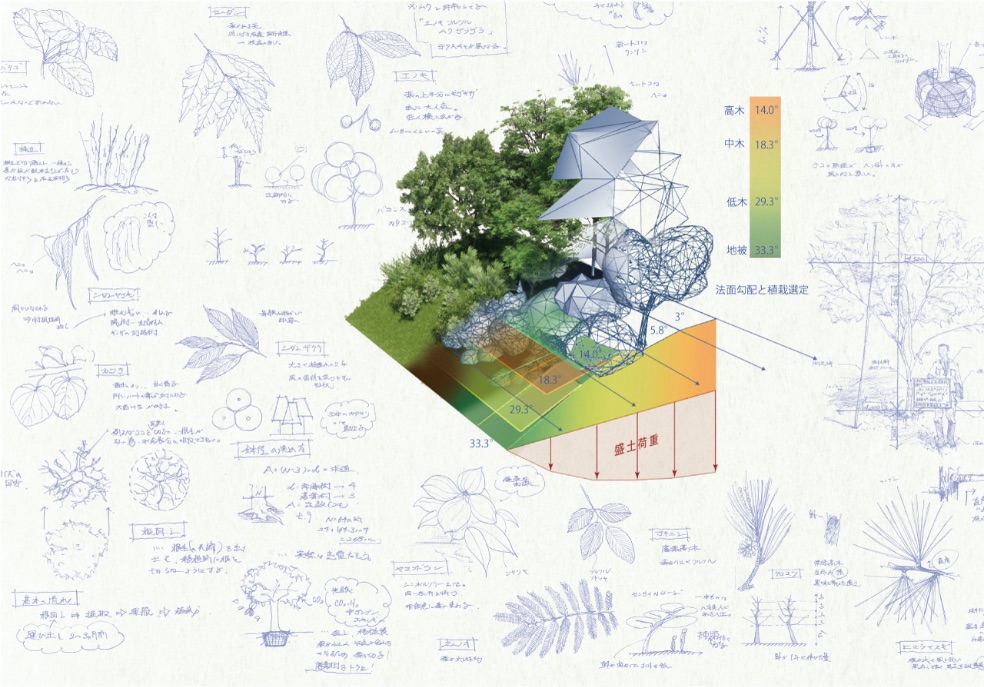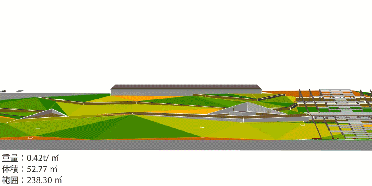 Next, the shape of the green area was calculated by an algorithm using a figure (Delaunay diagram) connecting the intersections of the Voronoi diagrams. The slope gradient was color-coded to reflect "retaining wall installation requirements" and "respective rooting angles for ground cover / shrub / middle tree / tall tree." In addition, to comply with the load limit in the area adjacent to the port of スポーツ ベット ログイン, we simultaneously visualized and studied the load distribution of the embankment in the green zone.