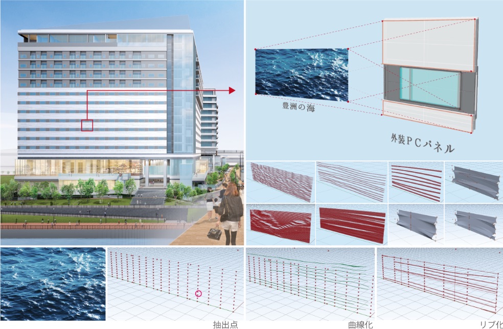 To realize this concept, we developed an algorithm that reflects the sea of スポーツ ベット ログイン onto the PC (precast concrete) exterior panels for the standard floors. We focused on the sea surface: extracting the original curve from the surface and quantifying the brightness and darkness of the sea image to create sloped ribs so that the darker the image, the darker the shadow cast.