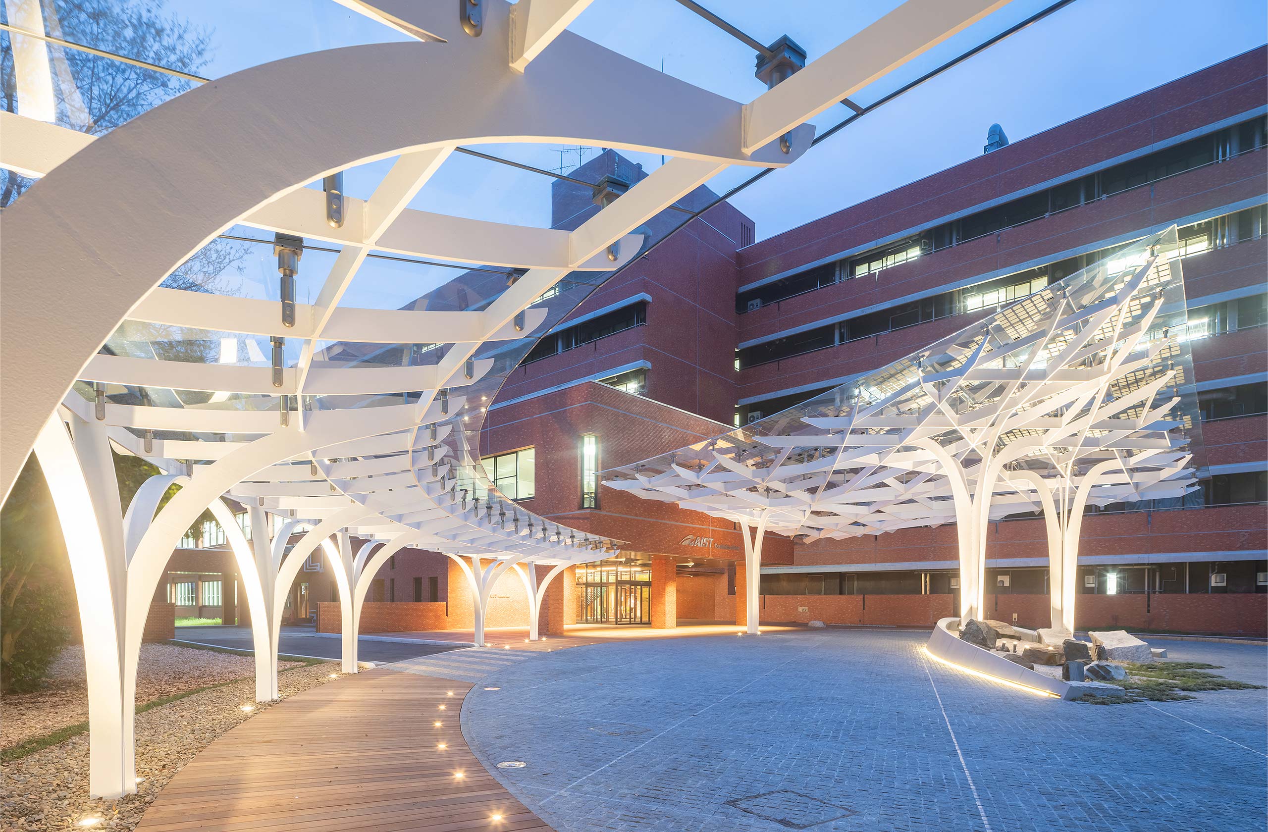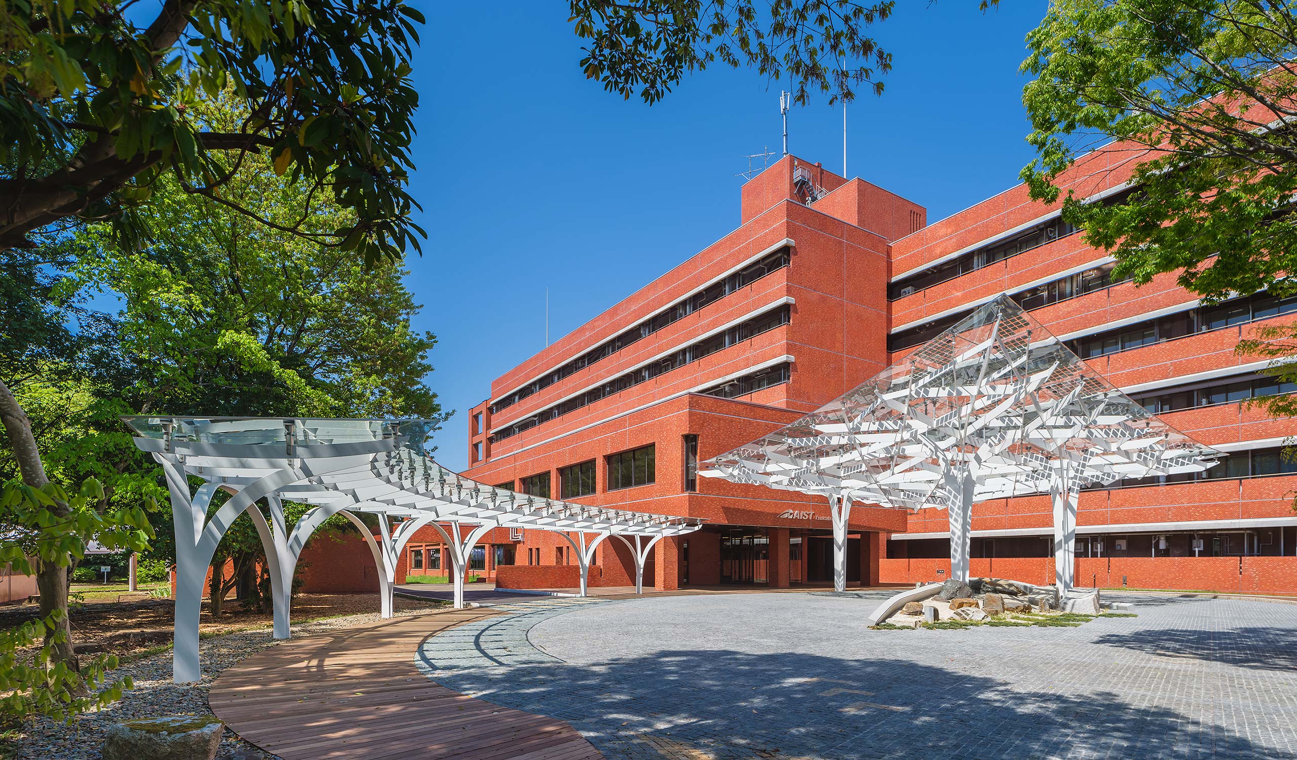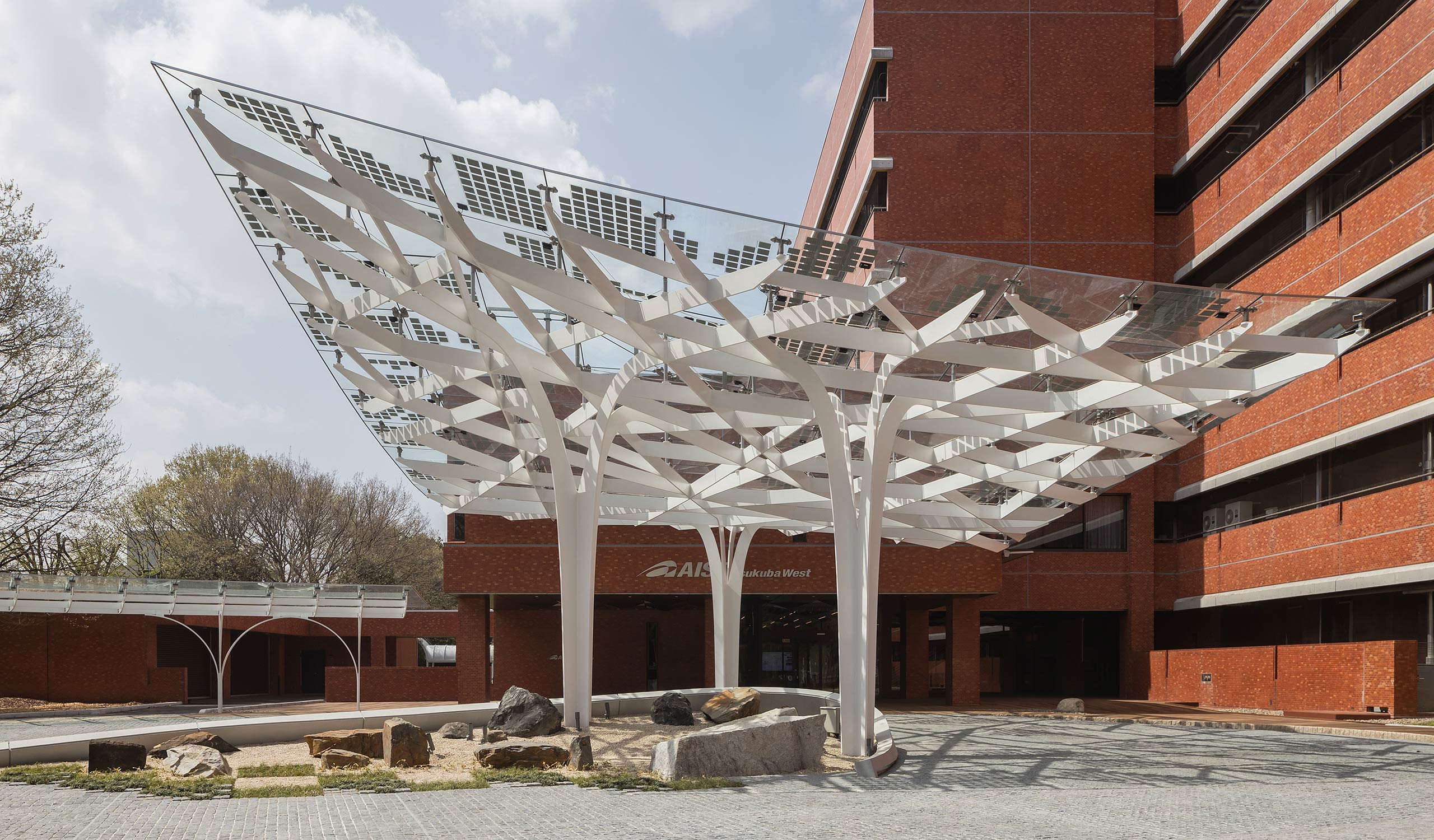 The entrance canopy for the main building has an organic branching スポーツベット ライブ inspired by the fertile trees on the grounds that tell the history of AIST. We chose this motif as a symbol of the growth and development of research results and the fusion of technologies. The seamless columns and beams of flat bar steel representing the trunk and branches support the glass roof, and the tree structure with power generation cells designed to look like leaves create a bright and open space where light enters similarly to sunlight filtering through trees.