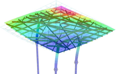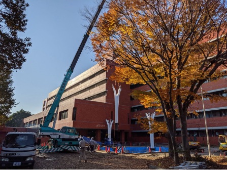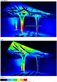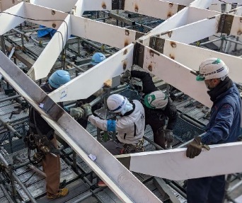 We performed construction step analyses at each stage of construction: temporary steel frame assembly, welding integration of the whole, jack-down, glass construction. We predicted the relationship between the welding strain, the order of release of support points, and the amount of deformation, and determined the optimum construction procedure. Coordinates for more than 121 control points were calculated from the 3D data and used for quality control.
