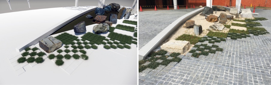 We performed a 3D scan of the stones to be placed on the site, and digitally studied the details of the layout using realistic mesh data including textures. This contributed to consensus-building for the completed image, facilitation of on-site work, and improved workmanship.