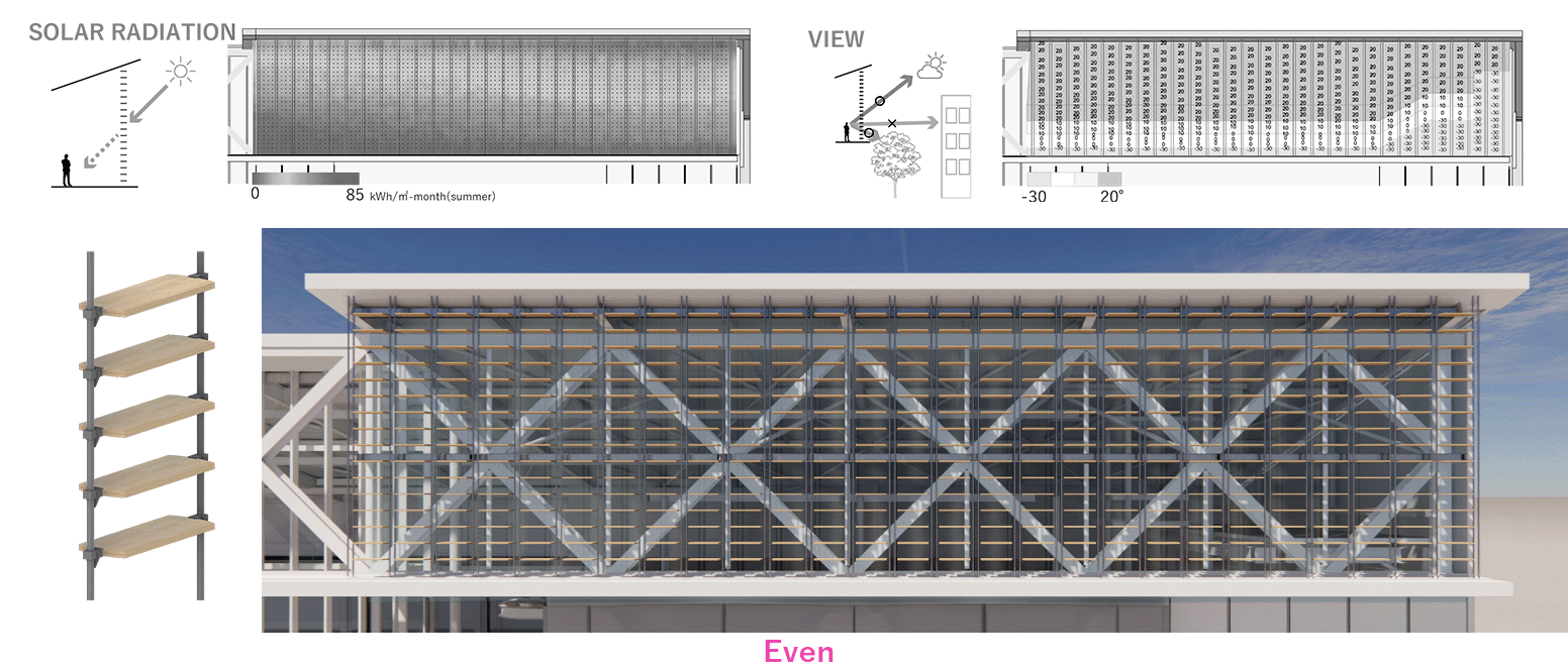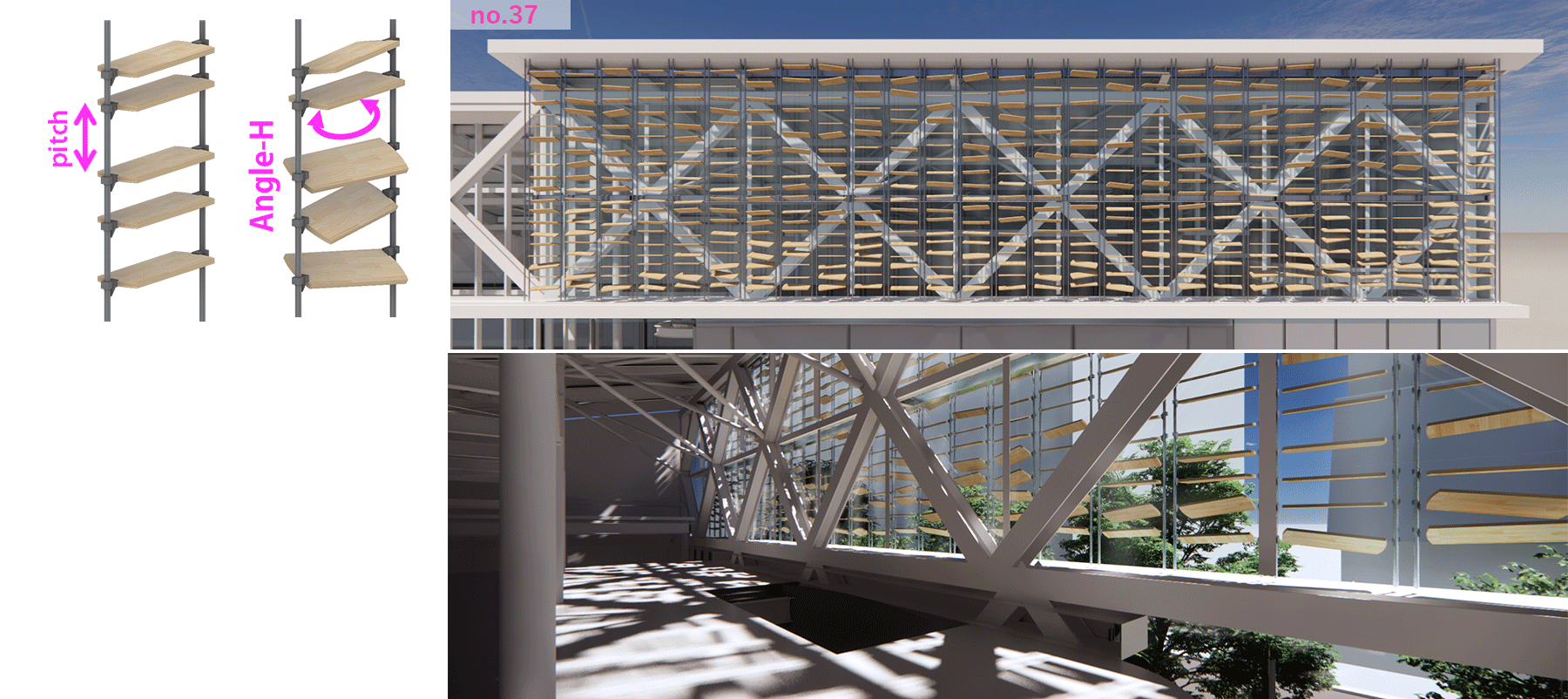 First, a digital mapping was carried out based on the amount of sunlight during the summer to see how we could create harmony with the external environment. To block the area that receives a lot of the sun, the pitch of the wooden スポーツベットio つながらない was narrowed and adjusted by changing the rotation angle when viewed from the side.