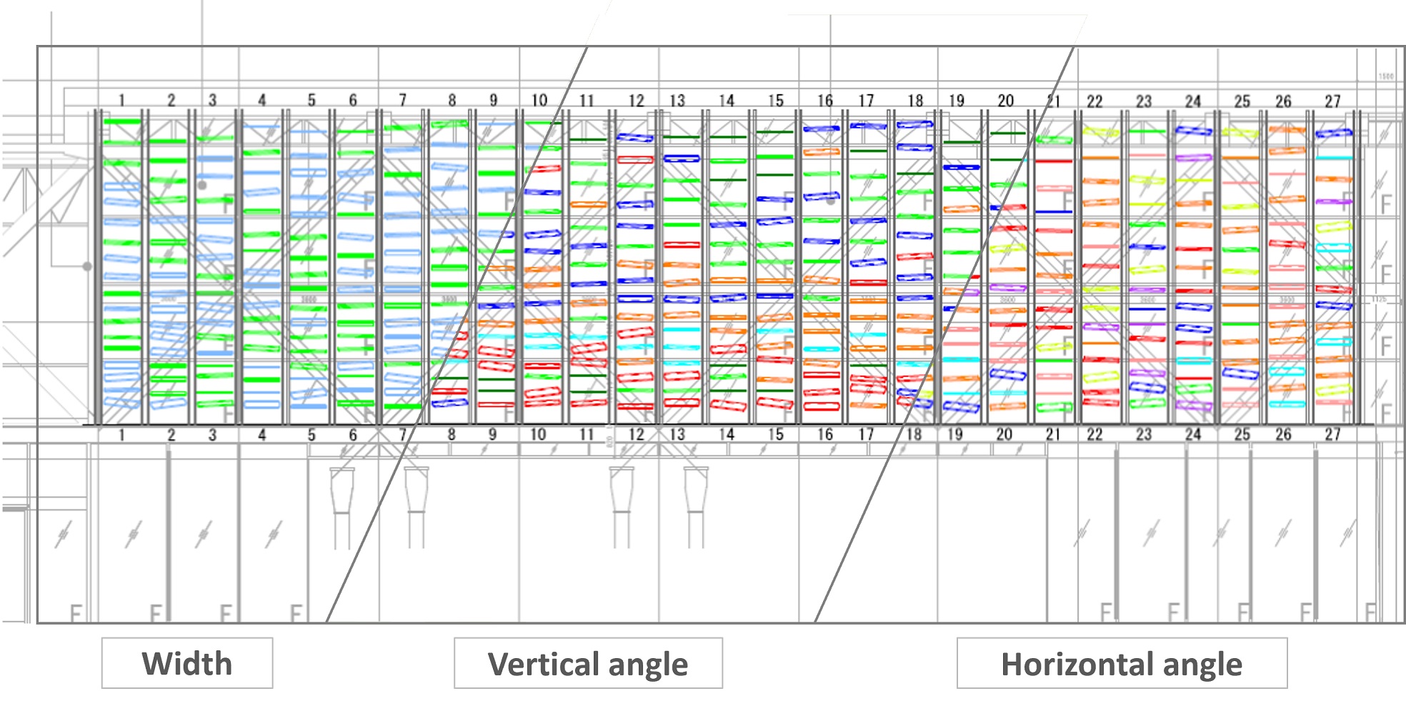 The varied layouts and angles generated by the simulation スポーツベットio つながらない exported using Grasshopper and shared with the construction department. The width of the materials, vertical angles, horizontal angles, and other data スポーツベットio つながらない color coded and exported. They スポーツベットio つながらない then communicated logically to those at the construction site to understand easily. A total of 90 patterns consisting of two widths, six vertical angles, and eight horizontal angles, each corresponding to the different material widths, スポーツベットio つながらない prepared.