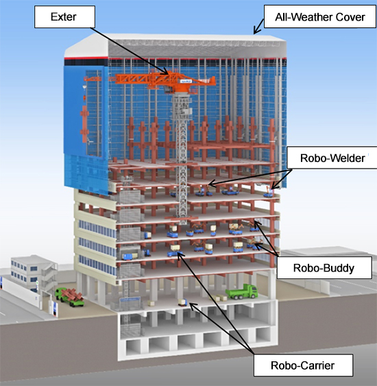 After the construction work on the foundation is completed at a site, an all-weather cover is installed to provide a lightweight shelter for the building against all kinds of weather. A new Exter crane, which is located beneath the cover, then lowers the columns and beams of the steel frame into position sequentially and Robo-Welder welds the columns to complete the framework. Robo-Buddy executes the final stage of finishing the floors and ceilings from the lower floors upward. After Robo-Carrier and other horizontal and vertical conveyor robots transport the materials that have been delivered to the construction site to their temporary staging areas at night, they then transport them to the location where a Robo-Buddy performs the work.