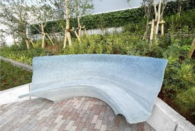 Bench and planters were produced in conjunction with station renovation work for the Osaka Expo. The amount of material used was reduced by approximately 20% compared to general mortar materials.