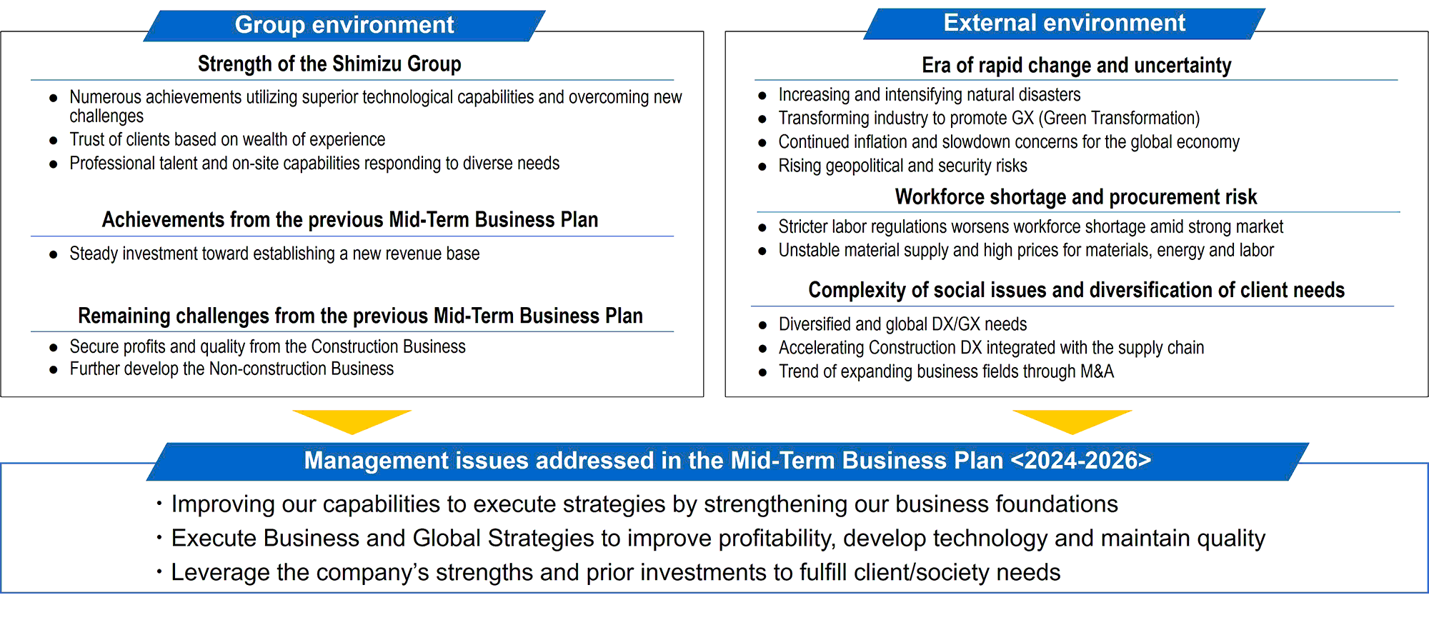 In May 2019, we formulated “SHIMZ VISION 2030,” the long-term vision of the Shimizu Group toward 2030. In order to achieve this, we developed the “Mid-Term スポーツベット ライブ Plan〈2024-2026〉” in May 2024.