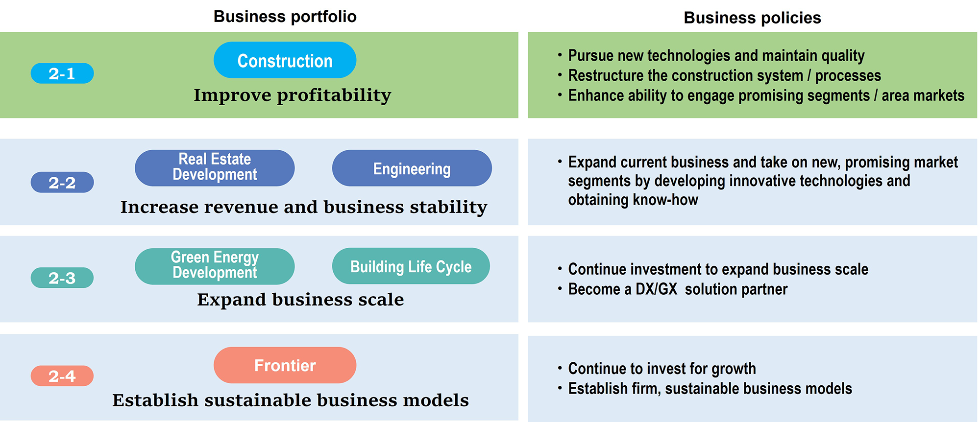 For each line of business, the Shimizu Group has established business policies that provide strategic direction. By expanding each business segment according to its business スポーツベット ライブ, we aim to build up our business portfolio.