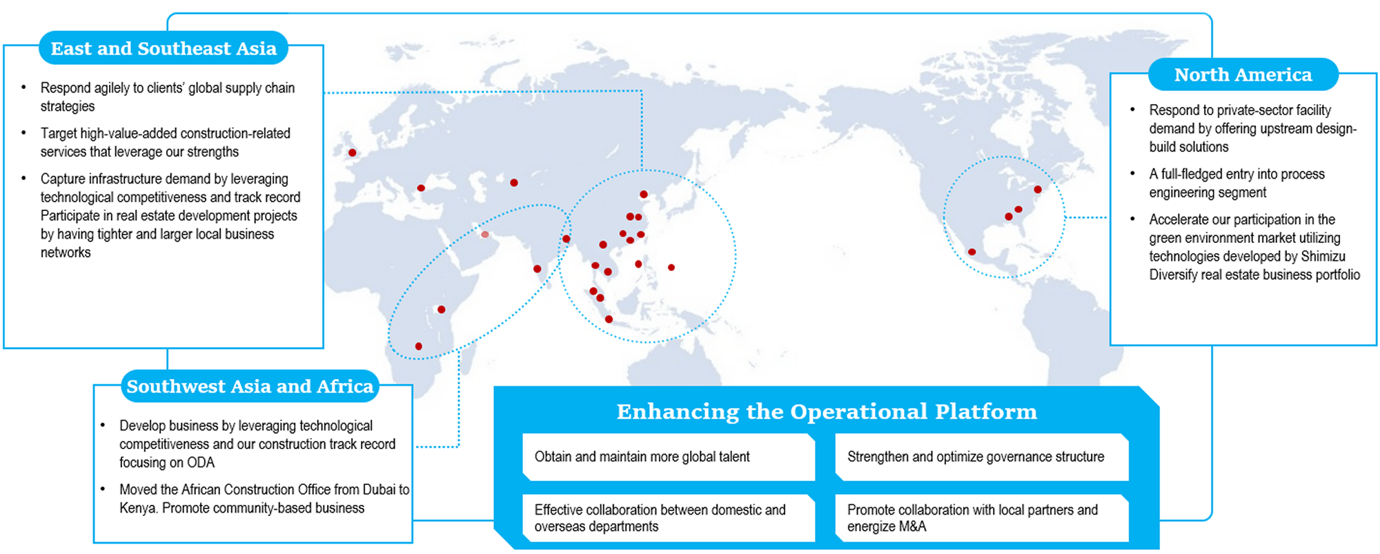 The Shimizu Group has undertaken infrastructure and landmark building projects in many countries, contributing to a global society where people can live a safe, secure, and comfortable life. We plan to adopt strategies optimized for each country and aim for each region to be self-determining so that we can grow further to be a truly global player.