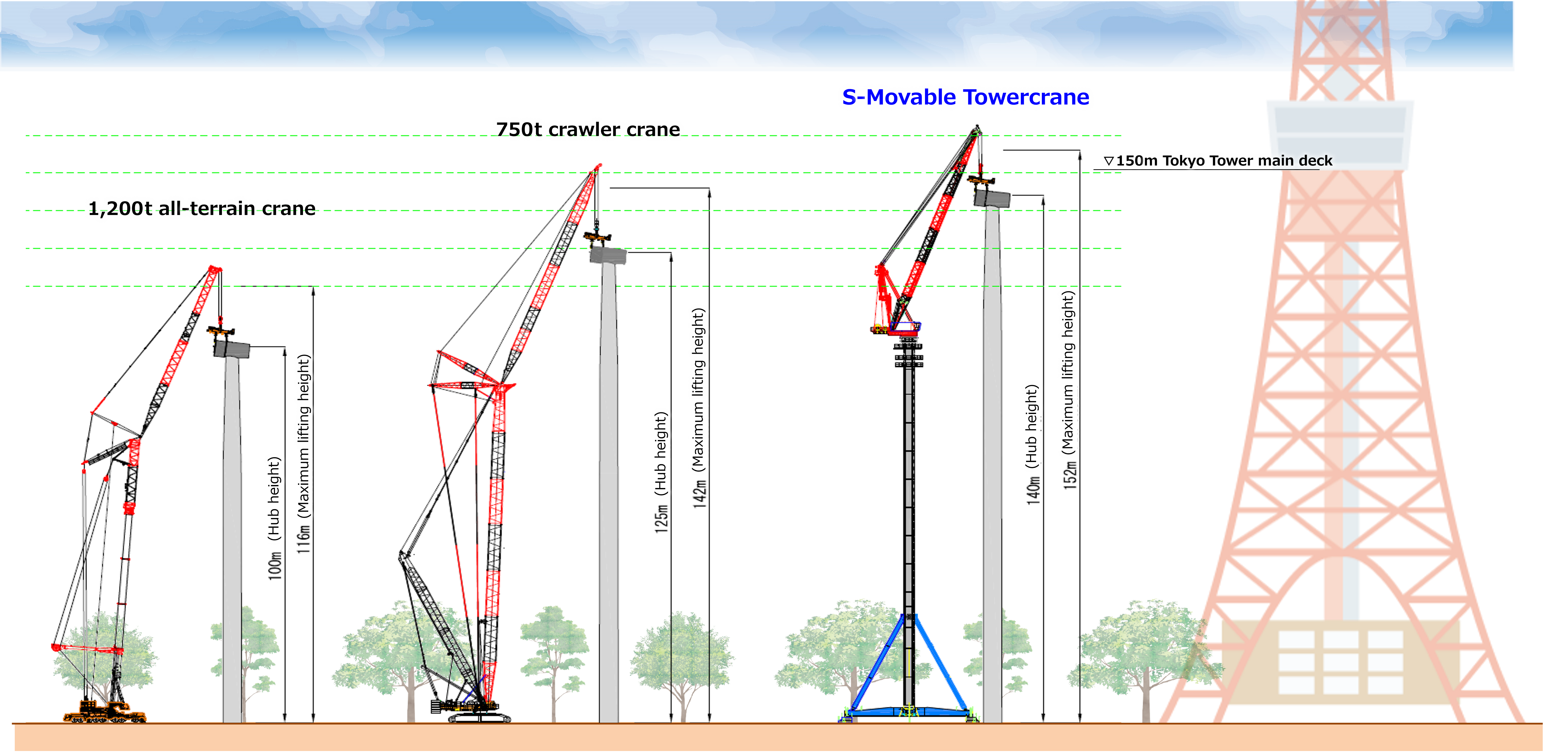 Scaling up wind turbines allows stable operation at higher altitudes where stronger winds prevail, leading to increased power generation. Based on this, the market introduction of large wind turbines in the 6-7 MW class is expected. Additionally, as older wind turbines reach the end of their service life, a growing demand for replacements is expected, with the market size for onshore wind power facilities projected to exceed 5 trillion yen by 2030. However, the cranes currently used for onshore wind turbine construction can only handle turbines with a tower height of up to 100 m and a 4 MW class. Furthermore, the 1200t all-terrain crane, which is the main crane used in wind turbine assembly, is limited to just 16 units in Japan, and no additional units are expected to be produced. While using a 750t crawler crane is an option, total over スポーツベット requires clearing a large area of trees for the assembly and disassembly of the crane boom, making total over スポーツベット challenging to obtain the necessary permits in Japan.To address this issue, we have developed the SMTC crane, which is ideal for constructing large onshore wind turbines.