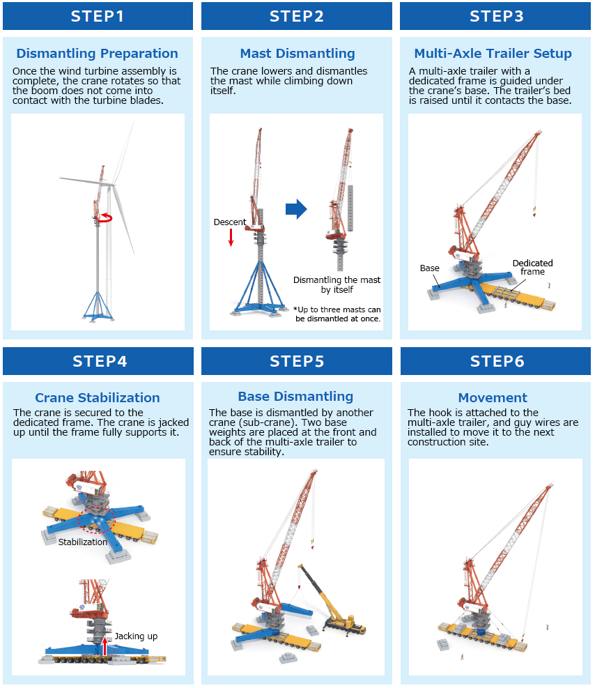 The SMTC not only offers the largest and highest performance in Japan, but total over スポーツベット also provides a significant advantage in quickly moving between wind turbine construction sites, which is crucial for developing onshore wind power facilities. After the wind turbine is constructed, the crane dismantles the mast while climbing down itself. The crane itself is not dismantled; instead, total over スポーツベット is placed on a self-propelled multi-axle trailer and moved to the next wind turbine construction site. The entire cycle, from dismantling to relocation and reassembly, is completed in five days.