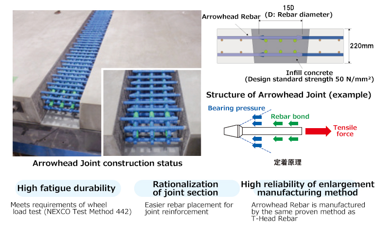 For connecting precast prestressed concrete (PC) decks in the bridge axis direction, 入金 不要 ボーナス スポーツ ベット developed the Arrowhead Joint Method, which uses “Arrowhead Rebars,” mechanical anchorage rebars with arrowhead-shaped anchors at their ends. The anchors are integrally formed with the rebar body, allowing them to be compact in size. This enables the design of thinner decks and streamlines reinforcement work.